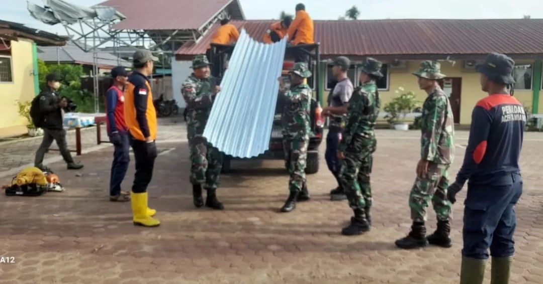 Gerak cepat Koramil 02/Karang Baru yang di pimpin langsung oleh Danramil Letnan Satu Inf Faisal Hadi kegiatan gotong royong bersama BPBD Aceh Tamiang dan Staf Kecamatan Karang Baru pasca Hujan Angin Puting Beliung yang mengakibatkan salah satu Sekolah mengalami kerusakan parah bertempat di SD IT Darul Mukhlisin desa Dalam, Kecamatan Karang Baru, Kabupaten Aceh Tamiang, Selasa (13/05/2025) pagi.