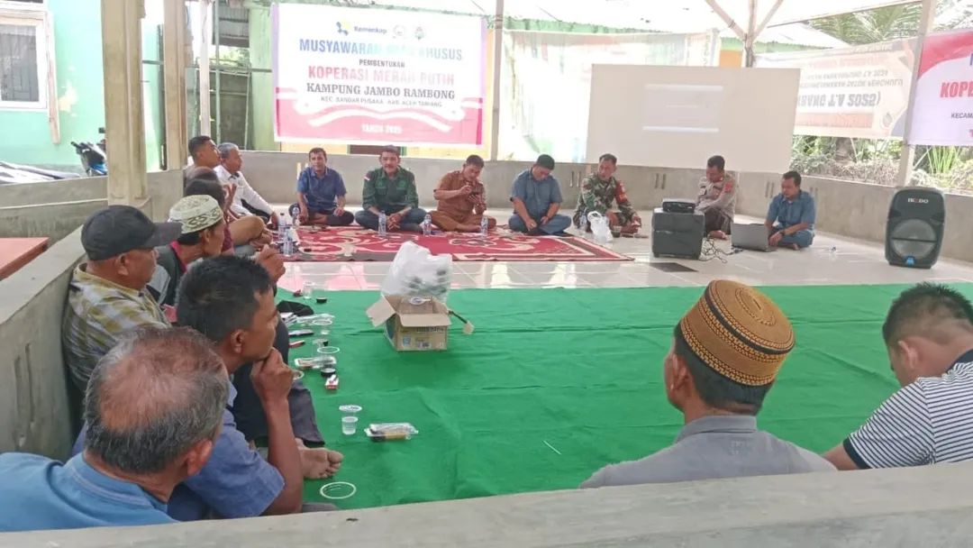 Sinergi tiga pilar wujudkan kemandirian ekonomi warga, bertempat di Aula kantor Datuk Penghulu, Desa Jambu Rambung, Kecamatan Bandar Pusaka, Kabupaten Aceh Tamiang, telah dilaksanakan Musyawarah Khusus Pembentukan Ketua dan Anggota Koperasi Merah Putih Syariah, Selasa (27/05/25). Kegiatan ini dihadiri oleh berbagai unsur pemerintahan dan masyarakat yang menunjukkan dukungan penuh terhadap penguatan ekonomi lokal melalui koperasi.