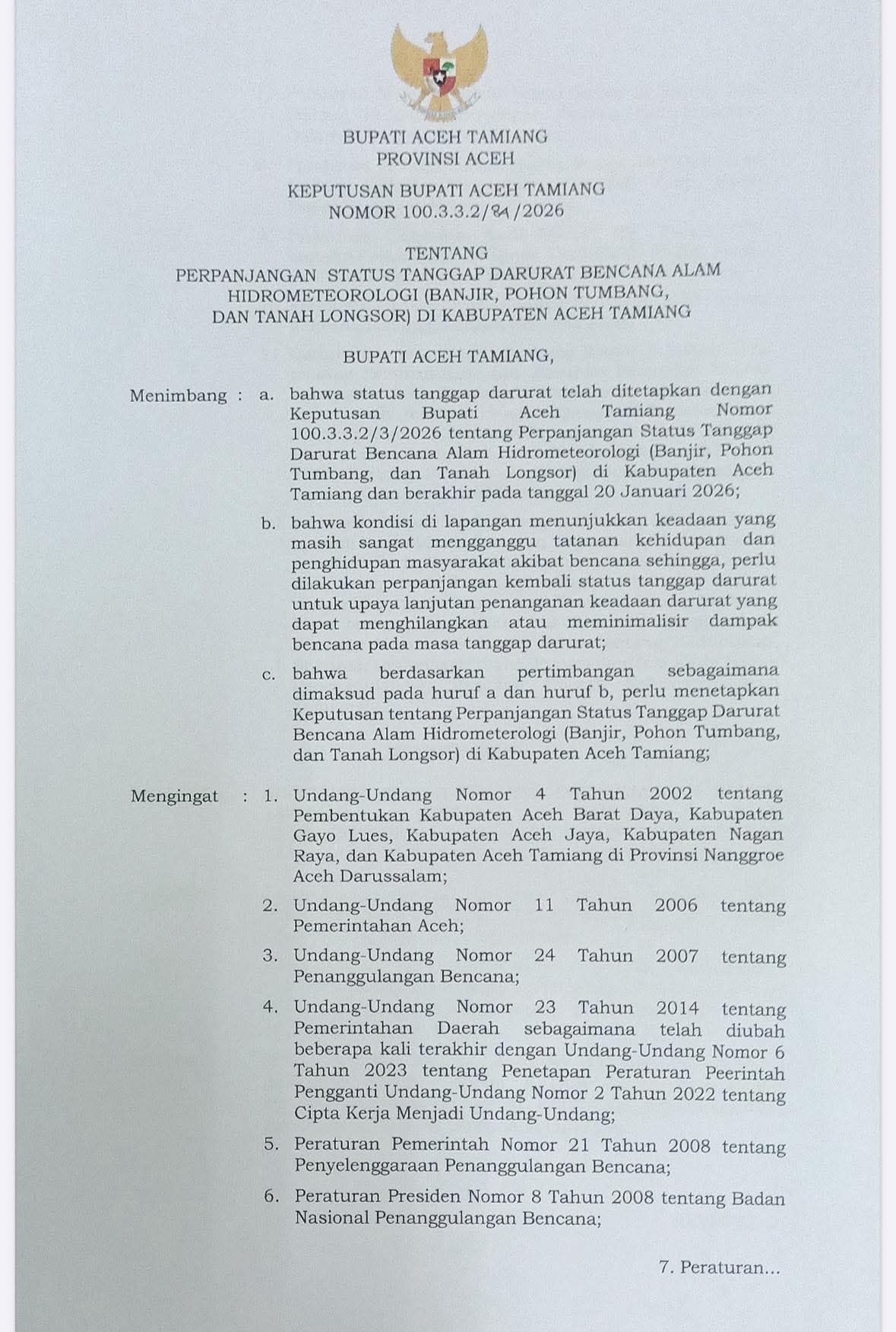 SUARA GARDA | ACEH TAMIANG  Melalui Keputusan Bupati Aceh Tamiang Nomor 100.3.3.2/84/2026 Pemerintah Kabupaten Aceh Tamiang resmi memperpanjang kembali masa Status Tanggap Darurat Bencana Alam Hidrometeorologi, yang meliputi banjir, pohon tumbang, dan tanah longsor. Langkah ini diambil sebagai upaya percepatan penanganan dampak bencana di wilayah tersebut, pada Selasa (20/1/26).