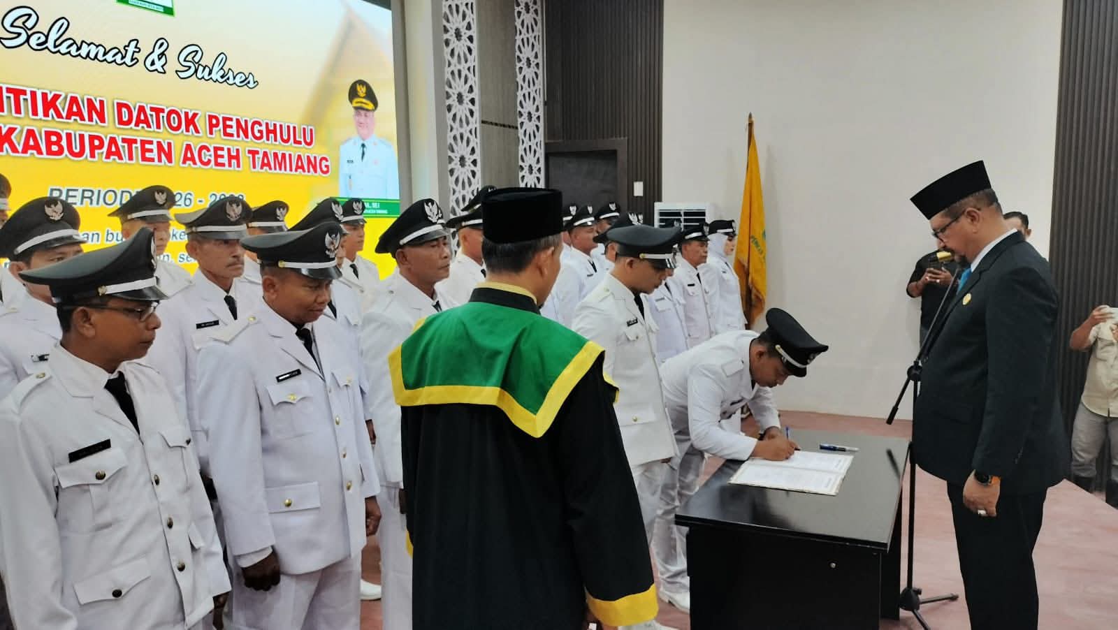 Proses pelantikan Datok Penghulu berbarengan dengan pelantikan Direktur PDAM Aceh Tamiang. Proses pelantikan turut dihadiri unsur Forkopimda, para Kepala OPD, serta perwakilan organisasi wanita di lingkungan Kabupaten Aceh Tamiang.[Indah]