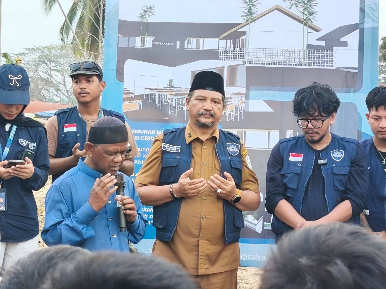 SUARA GARDA | ACEH TAMIANG Bupati Aceh Tamiang, Irjen Pol. (P) Drs. Armia Pahmi, MH bersama Ferry Irwandi, Choki Pardede, Yayasan Cakra Abhipraya Renponsif, Malaka Project dan Kitabisa.com melakukan peletakan batu pertama pembangunan Madrasah Diniyah Taklimiyah Awaliyah(MDTA) Al-Ihsan dan SDN Kota Lintang di Kampung Kota Lintang, Kec. Kota Kualasimpang, Senin, (26/1/26).