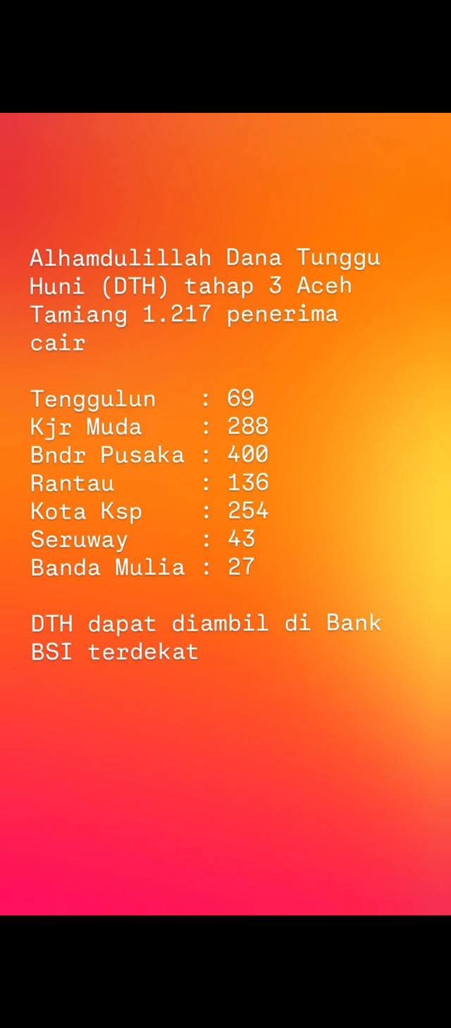 Dengan demikian total penerima Dana Tunggu Huni tahap III di Aceh Tamiang mencapai 1.217 kepala keluarga.