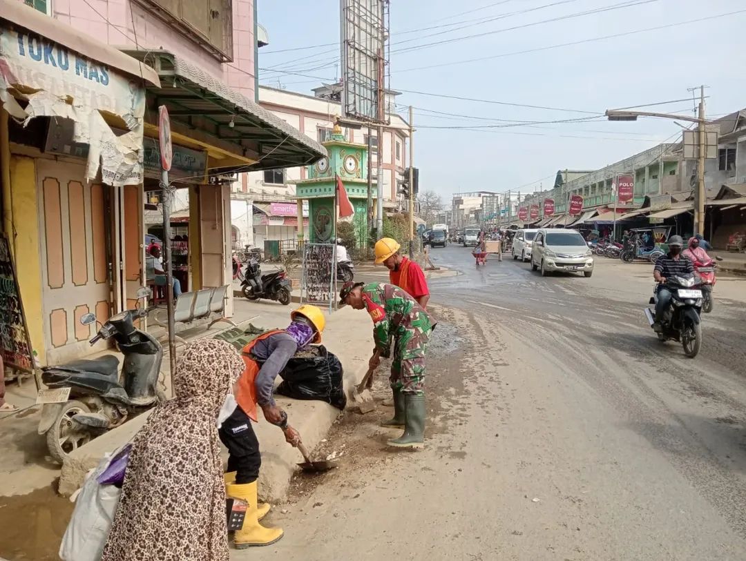 SUARA GARDA | ACEH TAMIANG Babinsa koramil 01/Kuala Simpang Serda Ariswan Efendi bersama warga masyarakat melaksanakan kegiatan gotong royong bersihkan sampah dan tana di jalan bertempat di sekitar kota Kuala simpang, kecamatan kota kuala Simpang, kabupaten Aceh tamiang. Kamis (12/03/2026)