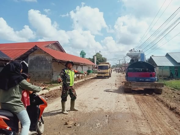 SUARA GARDA | ACEH TAMIANG Babinsa Koramil 04/Bendahara Sertu Iskandar Muda bersama personil Yon TP 853/BRB melaksanakan kegiatan pendampingan dengan membantu mengamankan lalulintas jalan bagi alat berat yang sedang bekerja membersihkan sisa-sisa lumpur yang ada di pinggir jalan pasca banjir di Desa Mesjid Sungai Iyu, Kecamatan Bendahara, Kabupaten Aceh Tamiang. Minggu (01/02/2026)