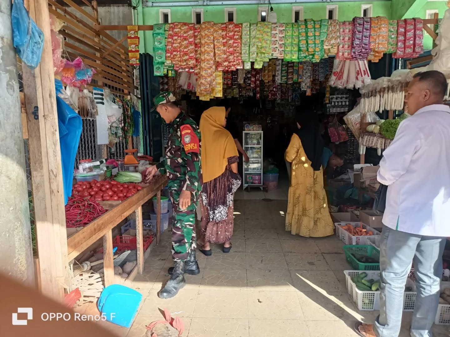 Dengan menyusuri lapak-lapak pedagang, Babinsa secara teliti memantau perkembangan harga sembako sekaligus berdialog langsung dengan penjual dan pembeli. Kehadiran Babinsa di tengah aktivitas pasar tradisional bertujuan memastikan distribusi bahan pokok tetap lancar serta mencegah terjadinya lonjakan harga pasca banjir.