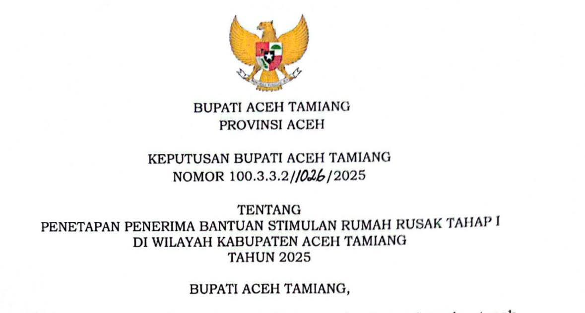 SUARA GARDA | ACEH TAMIANG Pemerintah Kabupaten Aceh Tamiang resmi menetapkan daftar By Name By Address (BNBA) masyarakat penerima bantuan stimulan untuk perbaikan rumah rusak Tahap I. Langkah ini merupakan bentuk komitmen nyata pemerintah daerah dalam mempercepat pemulihan infrastruktur hunian warga yang terdampak bencana.