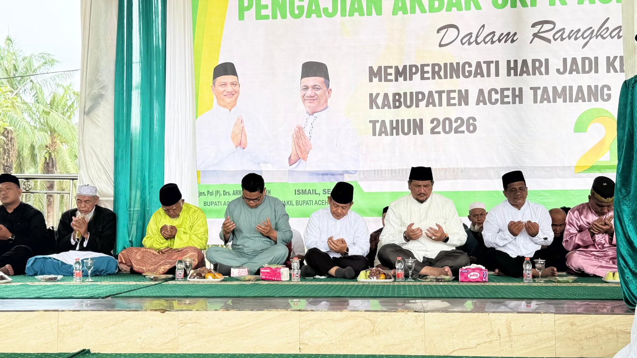 Pemerintah Kabupaten Aceh Tamiang menggelar pengajian akbar SKPK di Tribun Kantor Bupati, Kamis (9/4/26). Kegiatan ini menjadi rangkaian awal peringatan Hari Ulang Tahun ke-24 Kabupaten Aceh Tamiang yang jatuh pada 10 April setiap tahunnya.